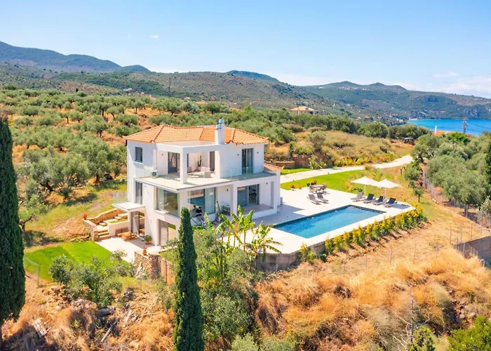 Az 3 hálószobát kínáló Villa Sadova Private Pool Panoramic View egy kinti úszómedencét kínál nyitott belső udvarral, ahonnan a tengerre nyílik kilátás. A Mount Taygetos 4 km távolságra van, míg az Aghios Nikolaos 4,1 kilométer távolságra található az ingatlantól.